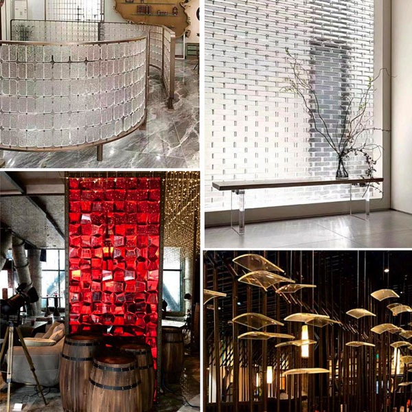 Stiklinės plytos naudojamos pertvaroms tarp erdvių, dušo kabinoms ir vonios sienelėms, virtuvės zonų atskyrimui ir laiptinėms. Jos puikiai tinka akcentinėms sienoms su apšvietimu, baldų integravimui kaip baro stalai ar registratūros, bei modernių apšvietimo nišų kūrimui.